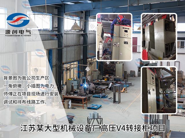 江蘇某大型機械設備廠高壓V4轉接柜項目,背景圖為我公司生產區一角俯瞰,小插圖為電力師傅正在項目現場進行安裝調試和排布線路工作。...